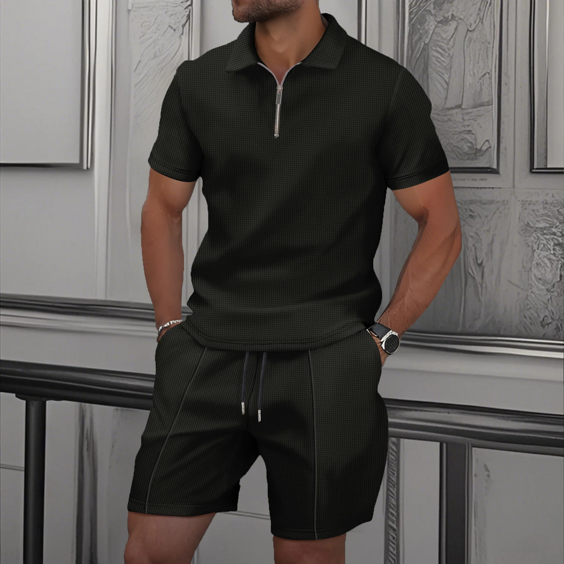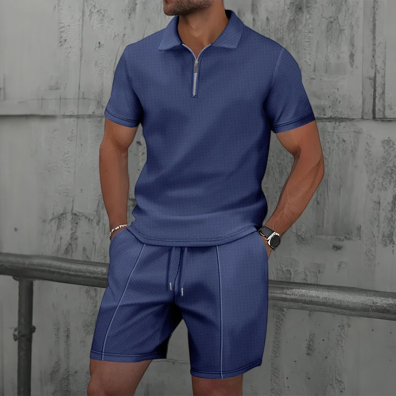 Новинка 2023 года, летние мужские шорты с короткими рукавами, комплект из Европы и США, вафельная однотонная футболка на молнии с лацканами, толстовка