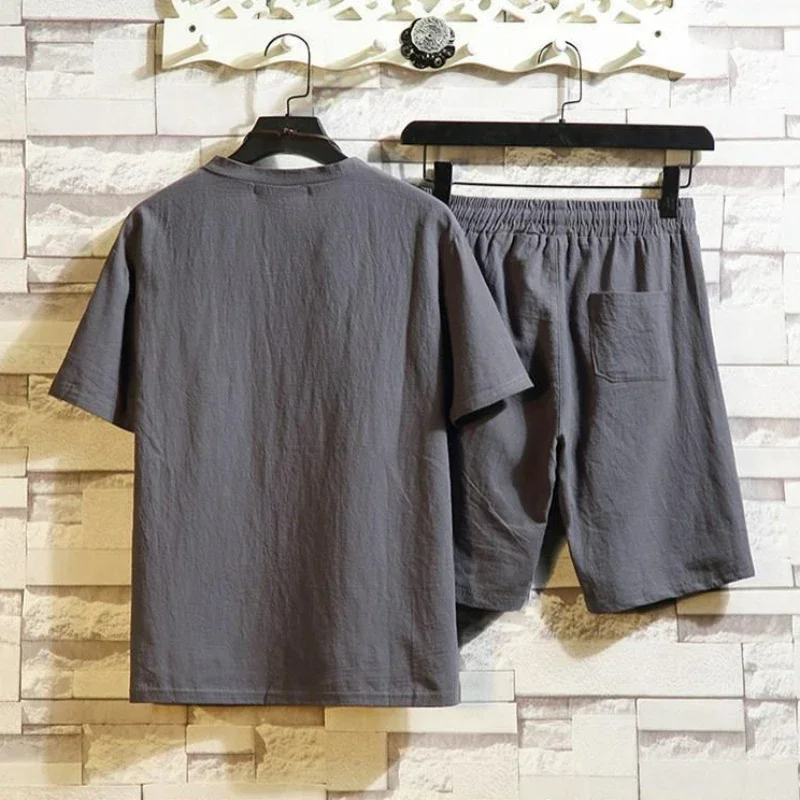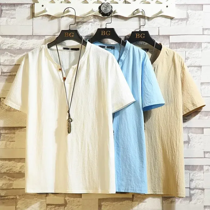 Новый мужской тонкий комплект большого размера из хлопка и льна с шортами с короткими рукавами, мужской однотонный трендовый льняной костюм для отдыха, спорта из двух предметов, лето