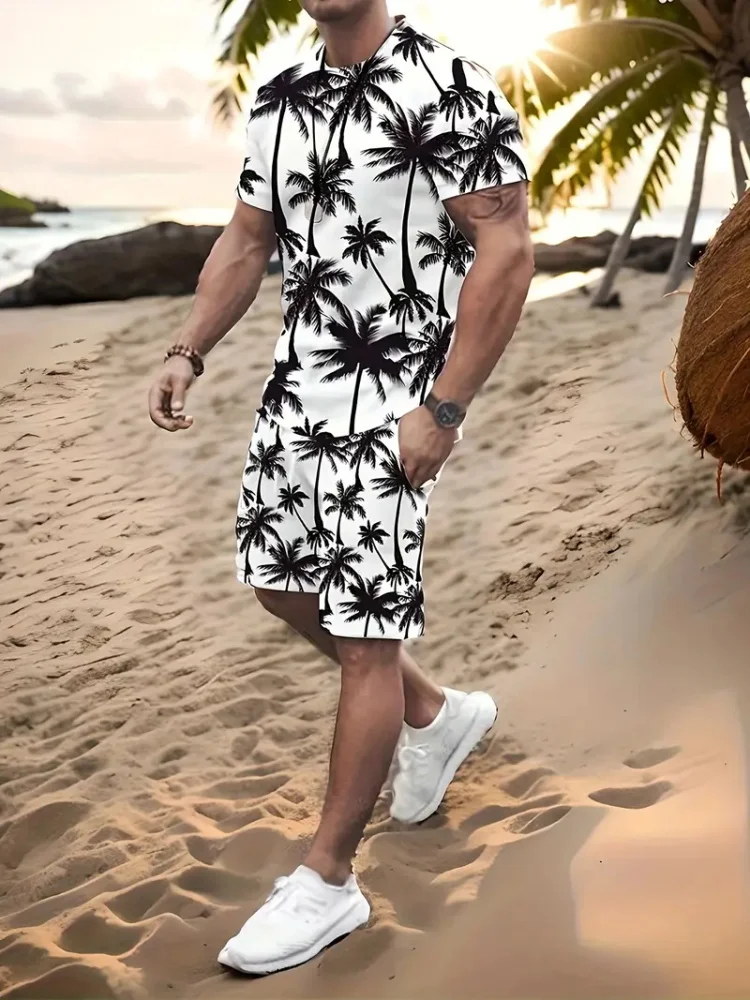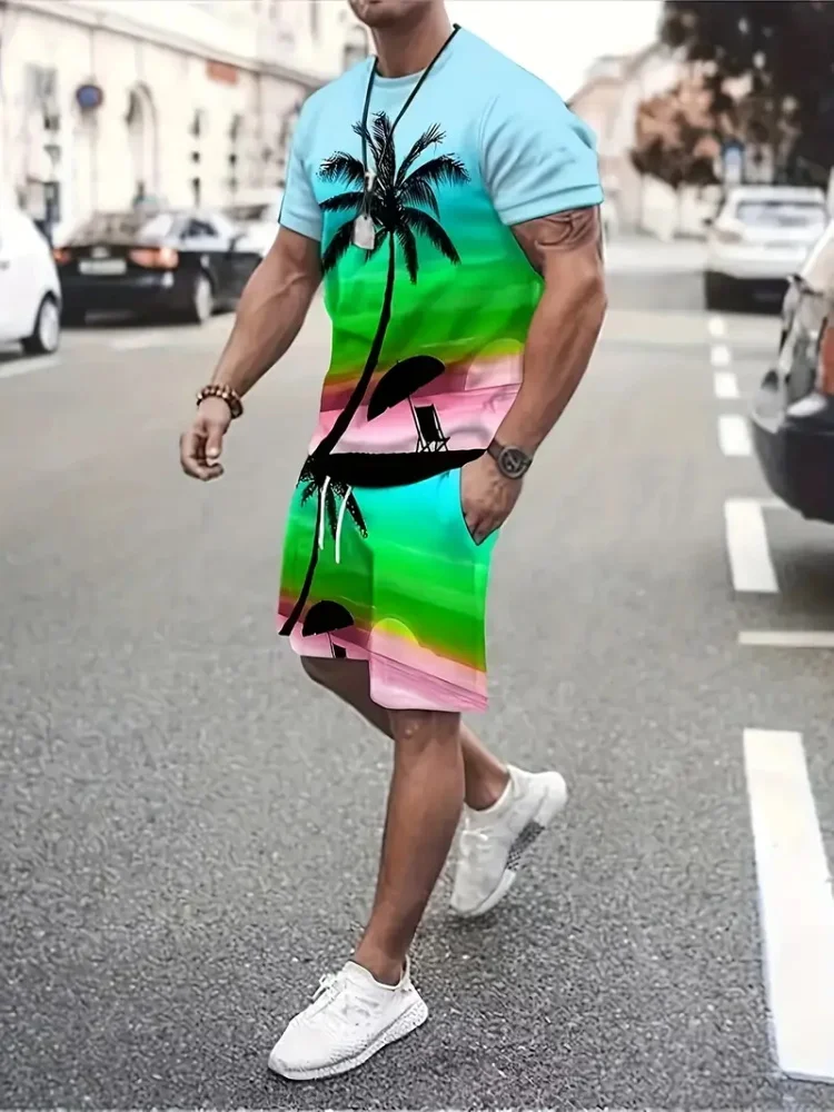 Гавайский кокосовый 3D принт, модный мужской костюм с круглым вырезом, повседневный повседневный костюм с короткими рукавами и шортами в стиле Харадзюку, уличный модный костюм