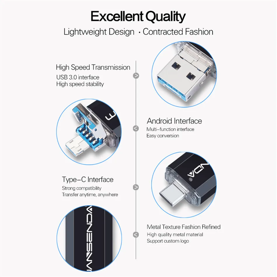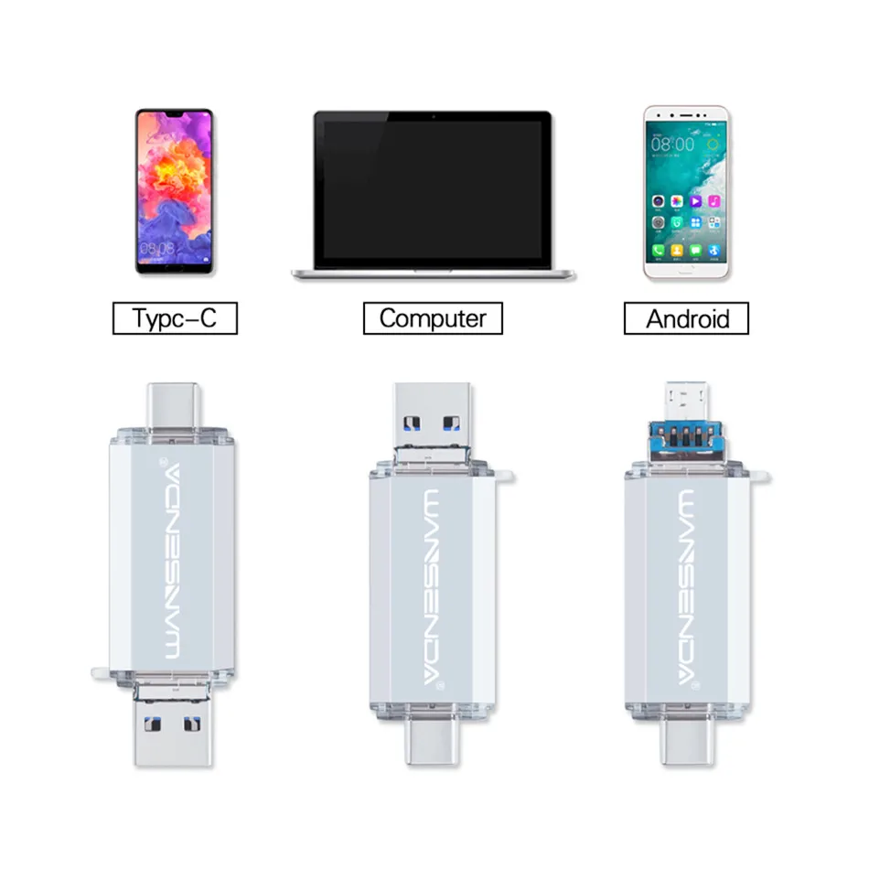 Флэш-накопитель WANSENDA 3 в 1 OTG USB 3.0 / USB TYPE C / Micro USB Pen Drive 32 ГБ USB Stick 3.0 64 ГБ 128 ГБ 256 ГБ 512 ГБ Флэш-накопитель