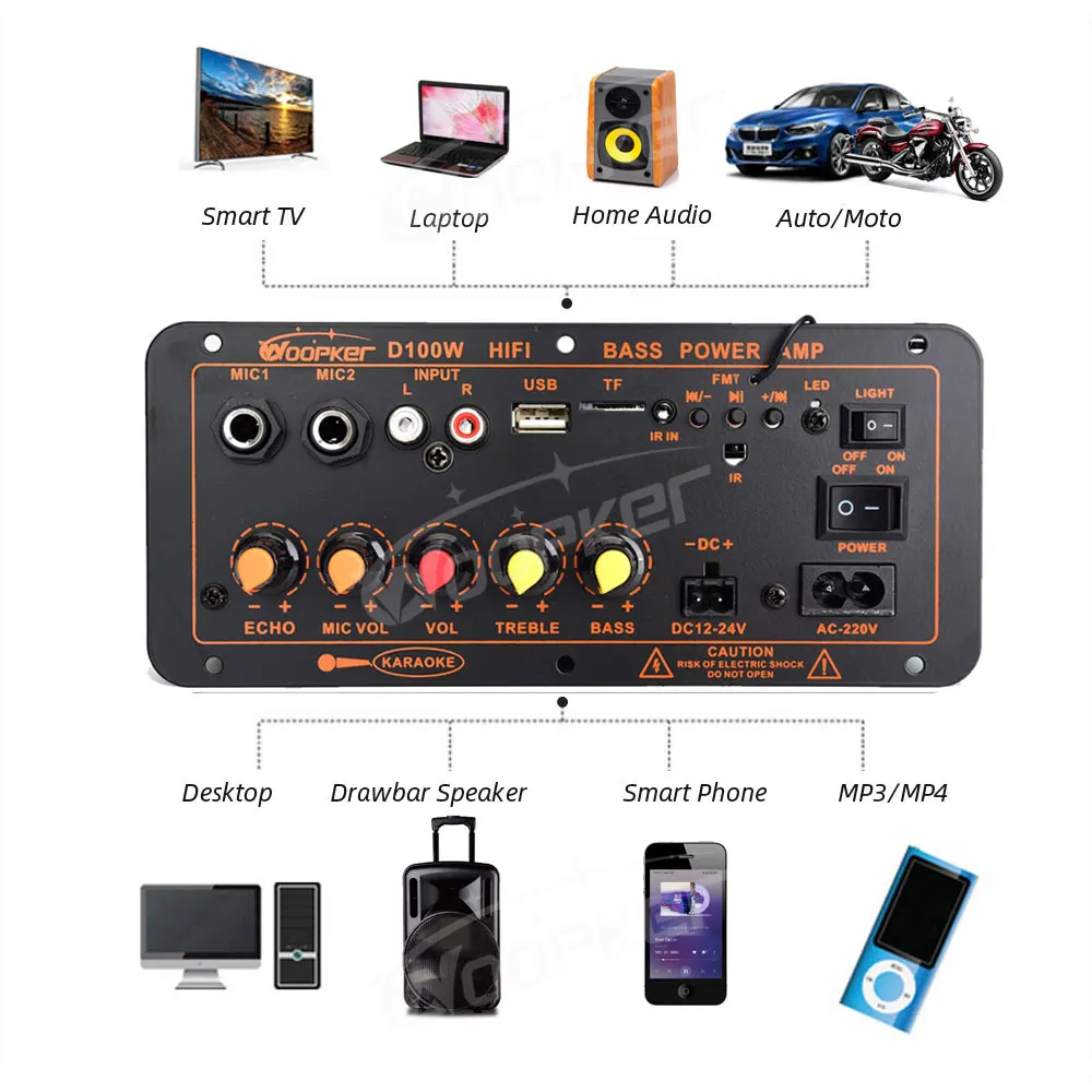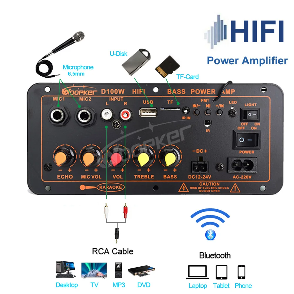 Woopker 300 Вт Bluetooth аудио усилитель плата D100 сабвуфер двойной микрофон модуль усилителя 12 В 24 В 220 В средний плеер