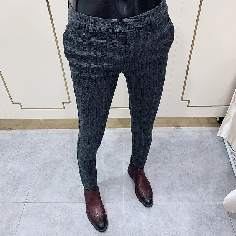 Брюки мужские шерстяные утепленные, деловые облегающие брюки в полоску, деловая одежда, брюки для офиса и вечеринок, Осень-зима