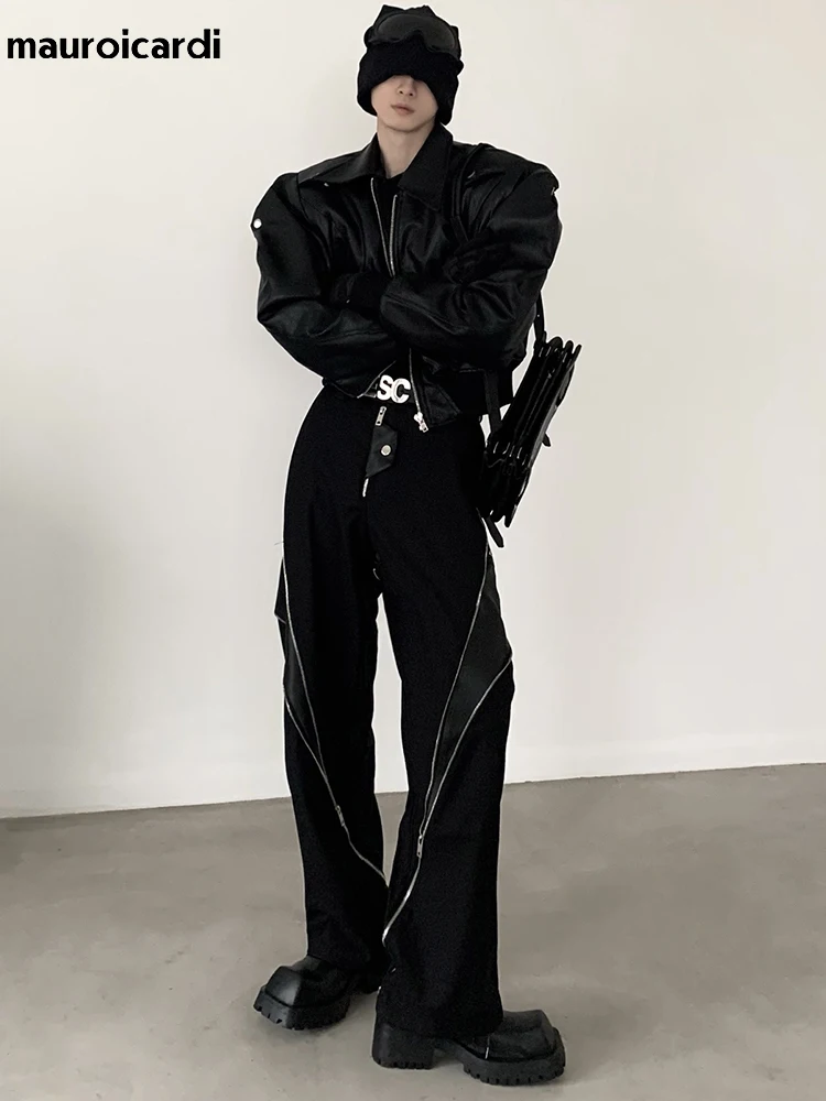 Mauroicardi Весна Осень Прохладный Красивый Короткий Оверсайз Черный Pu Кожаная Куртка Мужчины с наплечниками Длинный рукав Молния 2023 Роскошная дизайнерская верхняя одежда для мужчин Подиум Мода кожаная куртка мужска