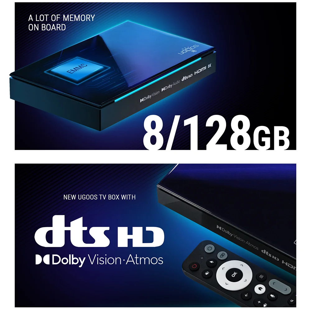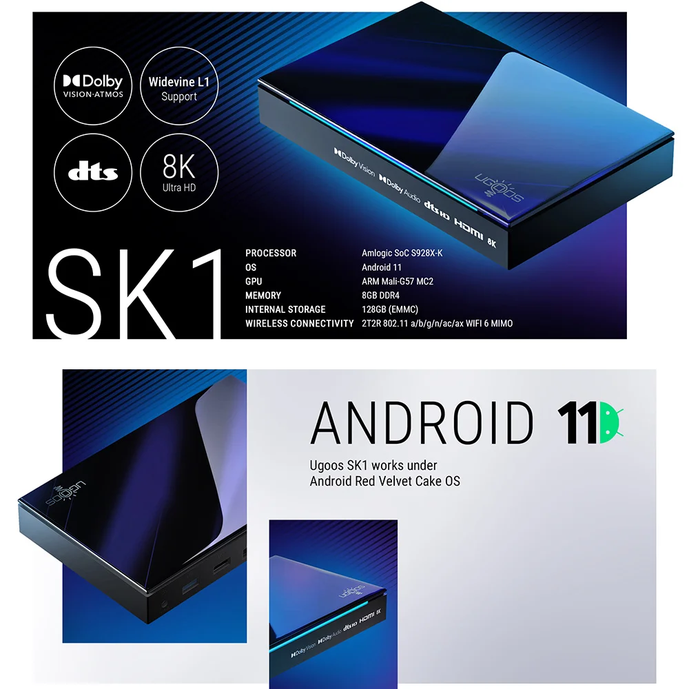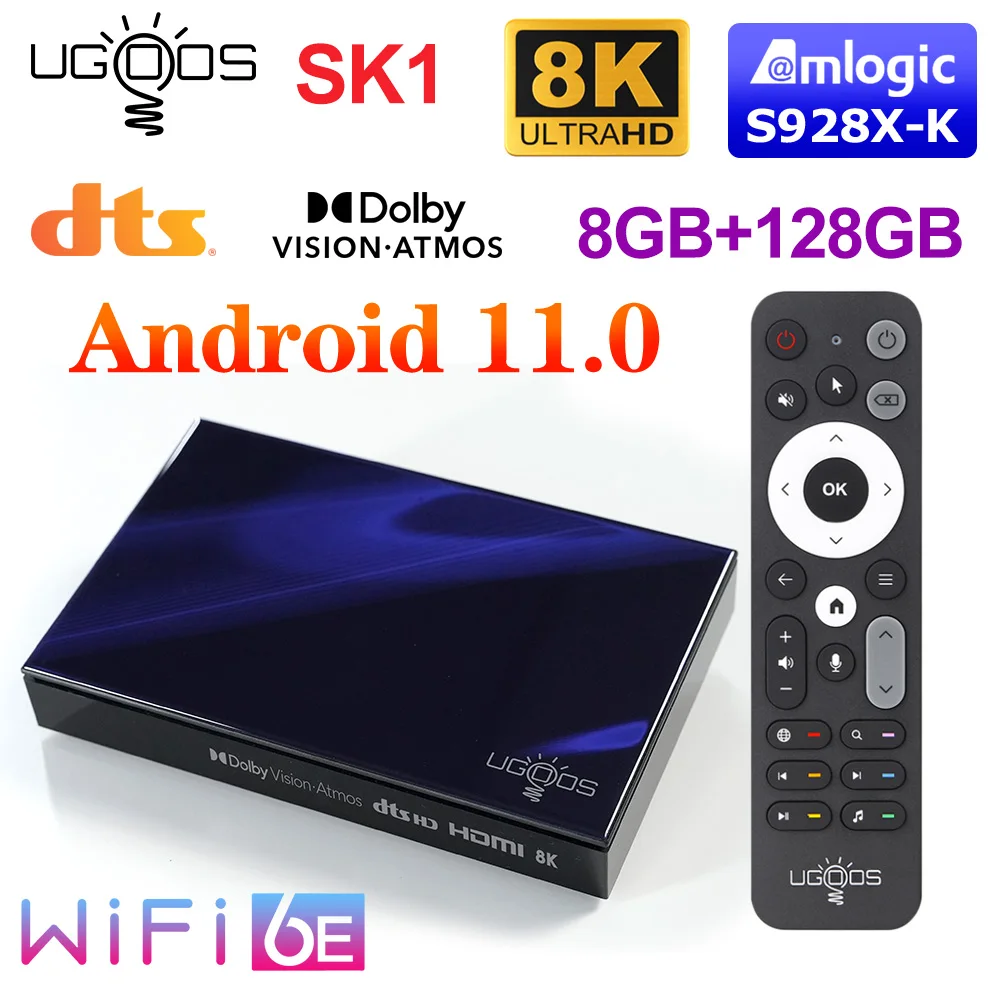 ТВ-приставка UGOOS SK1 Amlogic S928X-K Android 11,0 LPDDR4 8G128G Supoprt Dolby Vision/Audio/атмосферs DTS HD Widevine L1 WiFi6 1000M BT